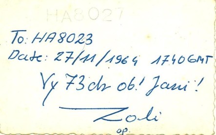 | A fenti fénykép hátoldala amit 1964-ben HA8-Ø27 megfigyelőszámmal HA8-Ø23 (akkor még szintén megfigyelő) HA8DL Szűcs Jánosnak küldött. |
