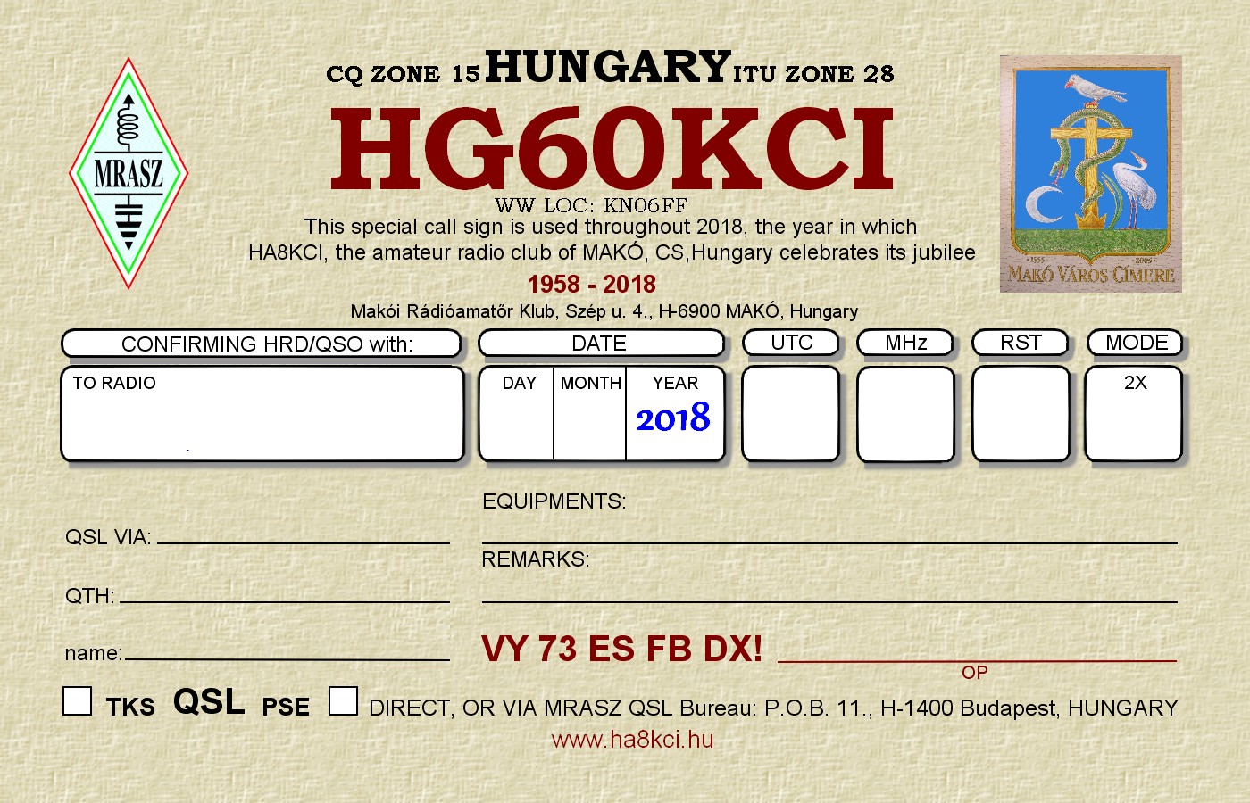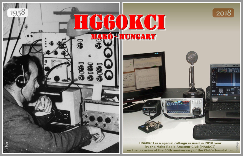 2018. évben a Makói Rádióamatőr Klub jubileumi H G 6 Ø K C I hívójelet használt