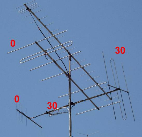 A képen látható, hogy az azonos *emelkedésű* antennák síkja ellentétes ezzel már kezdetben elejét vehetjük a keletkező intermodulációs termékeknek. A gyakorlatban vertikális eleváció nélkül ez a konstrukció hatékonynak bizonyult.